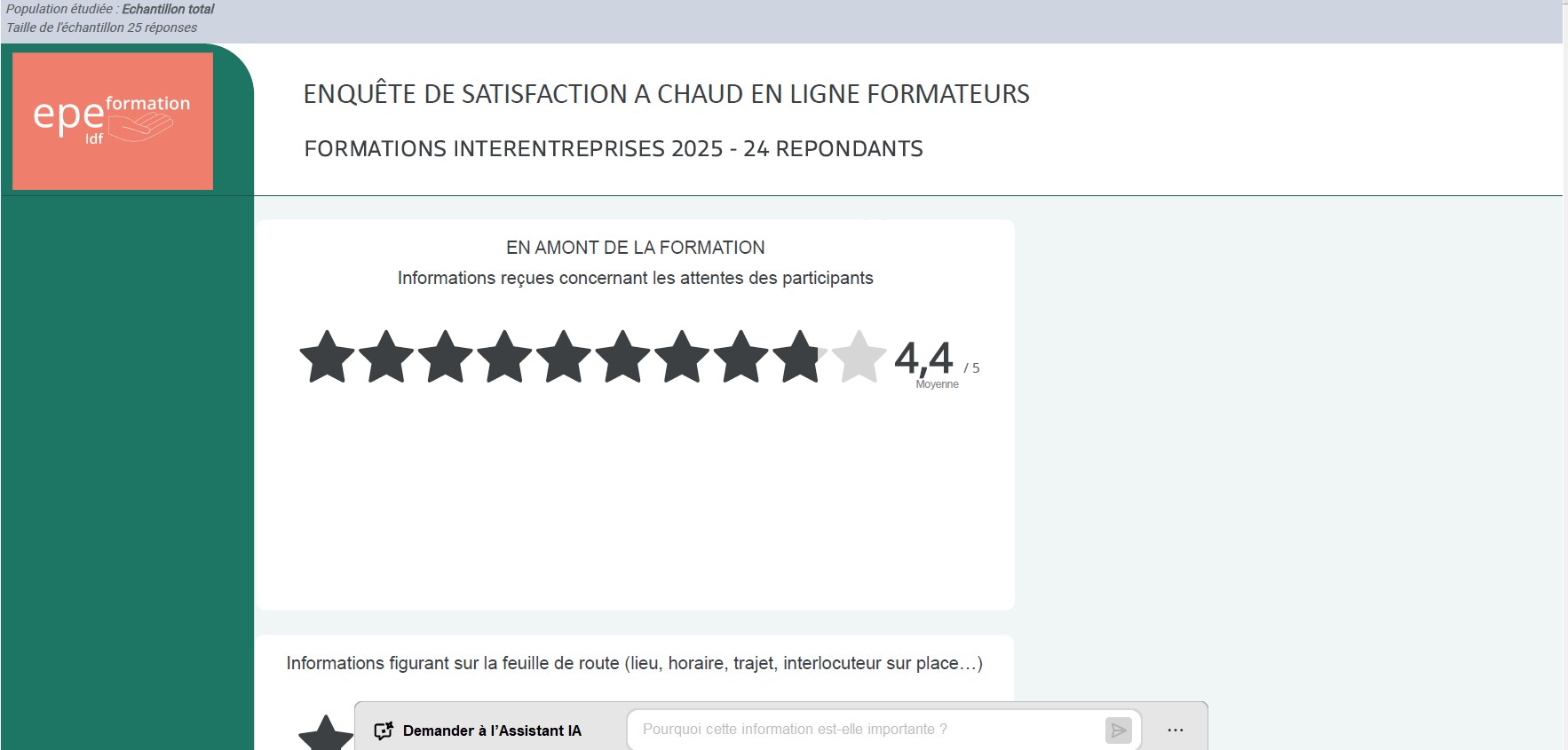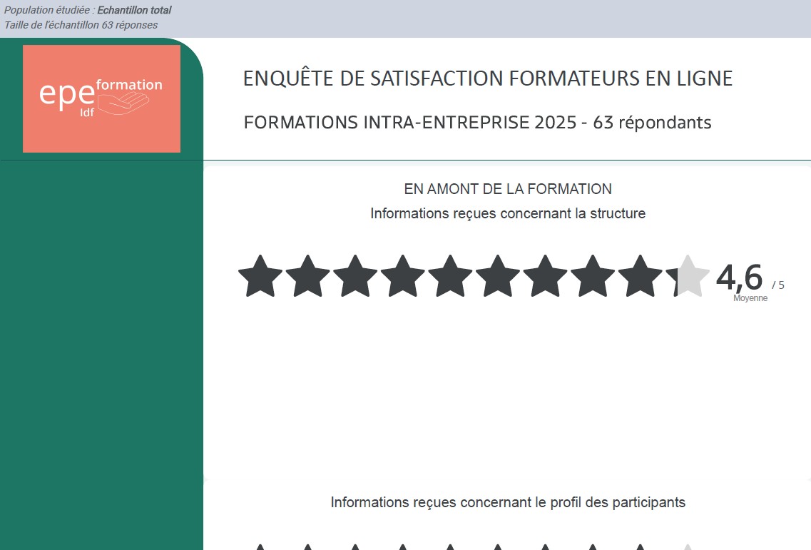 Retrouvez ici les résultats de notre enquête de satisfaction réalisée auprès de nos formateurs à la fin de chacune de nos formations courtes intra-entreprises en 2025.
